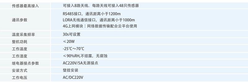 RFID 测温接收主机,内置了 RFID 读卡器的功能,可实时采集 RFID标签的温度,并进行运算存储,带有 RS485,Lora,4G 等多种通信功能,可方便灵活适应现场各种组网方式,主机可同时接入8 路接收天线,每路天线可接入 48只传感器。