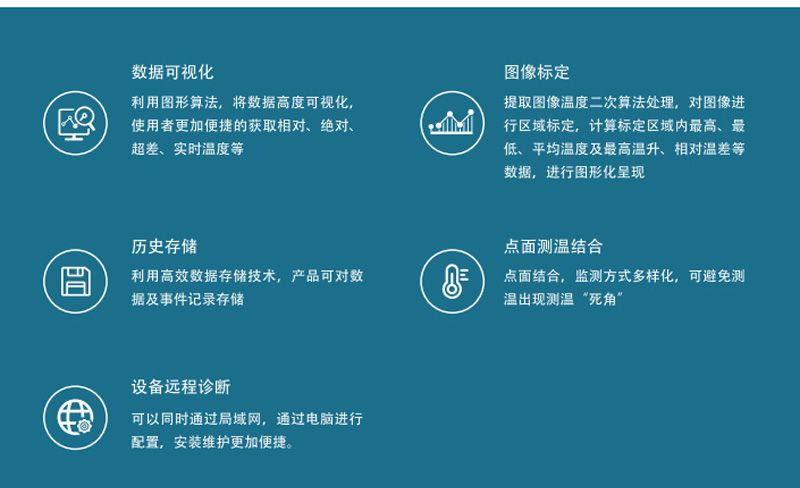 红外成像测温分析仪ZX600C主要针对解决在狭小区域进行温度测量,测温监测点不明确等温度监测问题,提出点面结合的温度测量方式,为开关柜狭小区域提供面测温。 产品运用成熟的图像编译算法、传感器、数据集成、数据可视化等技术实现温度数据的多元化方案,该产品具有点面温度实时监测、历史存储时间长、事件多层次分级处理、柜内红外面阵测温等优势功能。