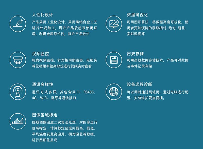 触屏红外测温成像分析仪主要针对解决在狭小区域进行温度测量,测温监测点不明确等温度监测问题,提出点面结合的温度测量方式,为空间狭小区域提供面测温、视频监控。 产品运用成熟的图像编译算法、无线远传、传感器、数据集成、数据可视化等技术实现温度数据的多元化方案,该产品具有点面温度实时监测、历史存储时间长、通讯多样、事件多层次分级处理、汇聚传感器多等优势功能。